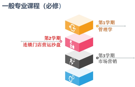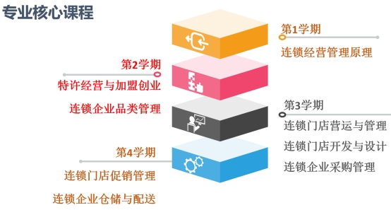 本专业核心专业课程包括:连锁经营管理原理、特许经营与加盟创业、连锁企业门店营运与管理、连锁企业采购管理、连锁门店开发与设计、连锁企业品类管理、连锁门店促销管理、连锁企业仓储与配送。一般专业课程包括:管理学、连锁门店营运沙盘、市场营销、经济学基础、连锁企业人力资源管理、电子商务概论、中国商贸文化、商务礼仪、消费者行为学、经济法、顶(跟)岗实习等。其中管理学、连锁门店营运沙盘、市场营销、经济学基础、连锁企业人力资源管理等课程、顶(跟)岗实习为必修,电子商务概论、中国商贸文化、商务礼仪、消费者行为学、经济法等课程为限定选修课。