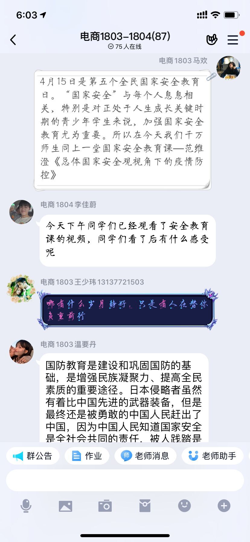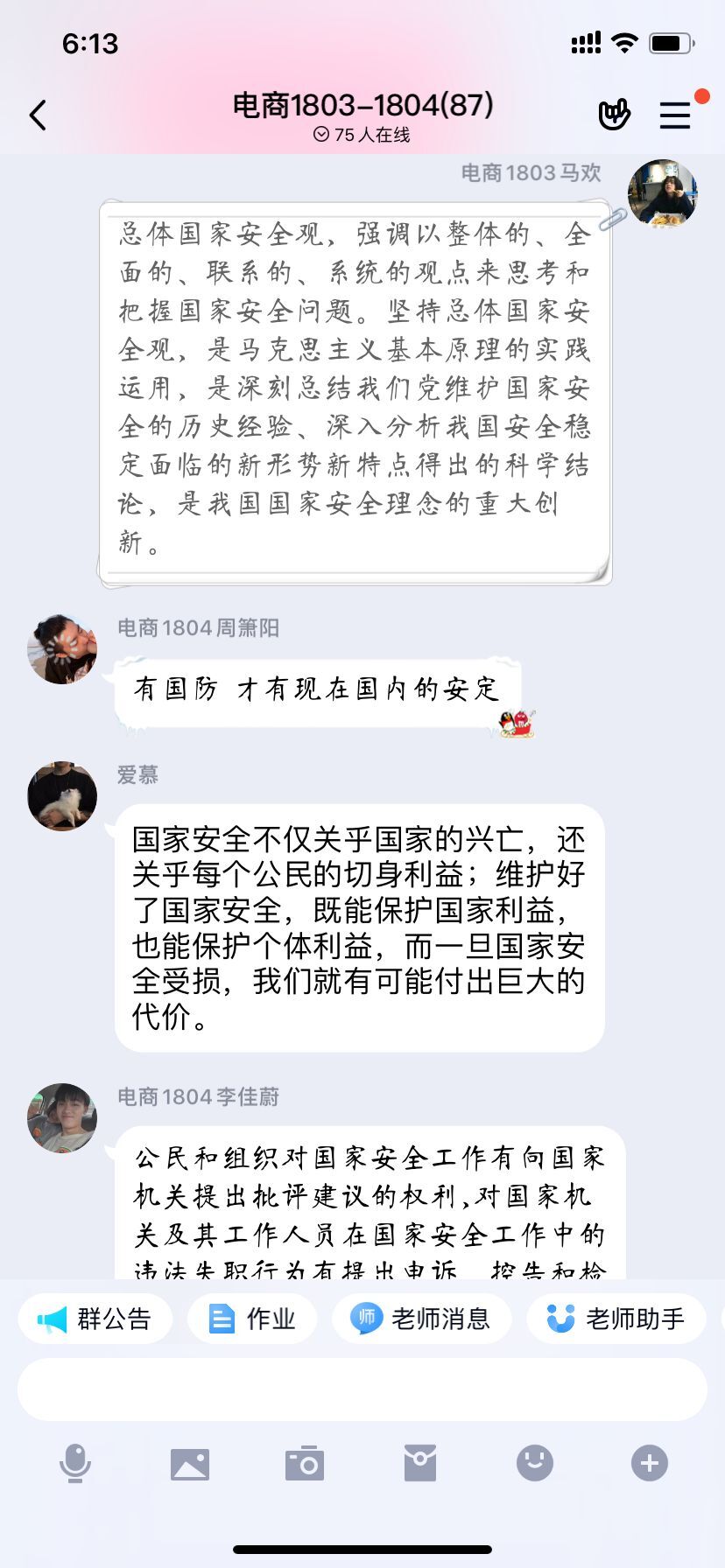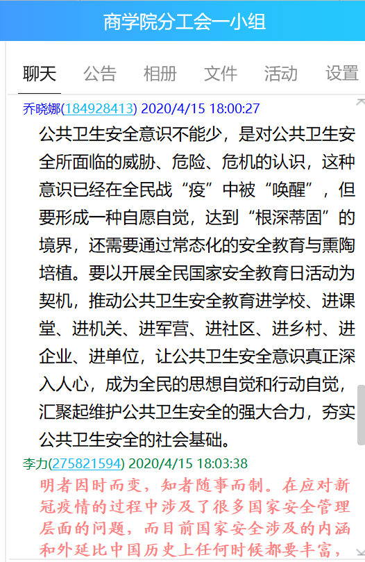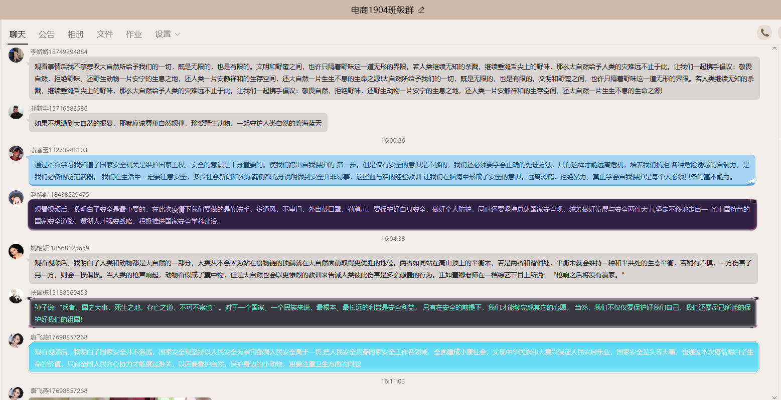 通过线上班会,同学们结合国家安全的相关知识和实际生活事例进行了热烈讨论,疫情当下,结合依法防控新冠肺炎疫情,更有针对性地宣传传染病防治内容,针对一些典型案例进行以案说法,加强了警示教育。通过在线答题的方式,深化学习效果,增强全体师生国家安全意识,共同筑牢国家安全人民防线。