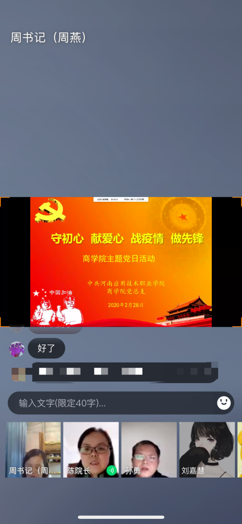 2月28日晚上,kaiyun登录中国入口登录全体党员同志以网络视频的形式召开了一次特殊的主题党日活动。此次党日活动是积极响应习近平总书记关于新型冠状病毒感染肺炎疫情防控系列重要指示批示精神,充分发挥好疫情防控期间基层党组织战斗堡垒作用和党员先锋模范作用,根据学校《关于组织开展“守初心、献爱心、战疫情、做先锋” 线上主题党日活动的通知》召开的。学校党委委员陈君丽同志作为支部成员全程参与主题党日活动。周燕副书记主持活动。