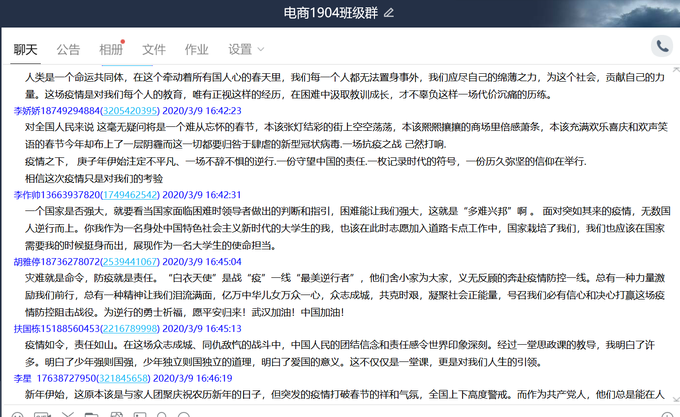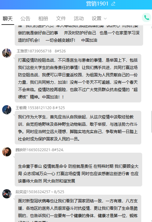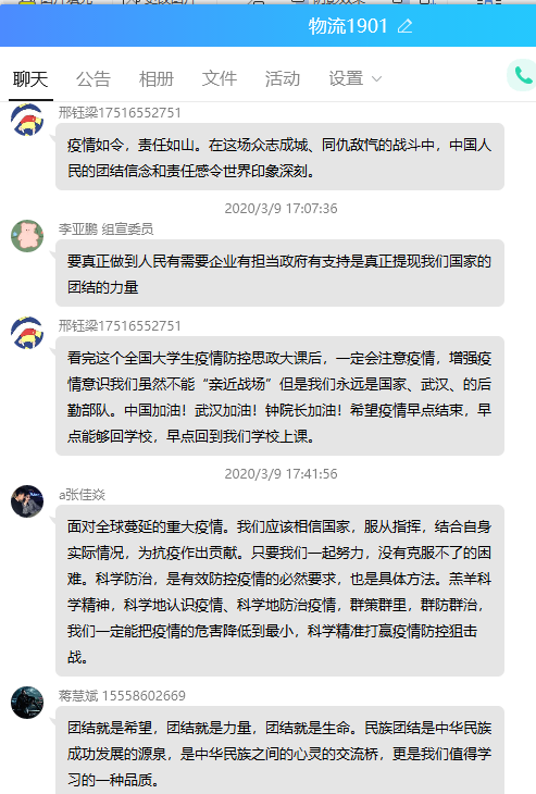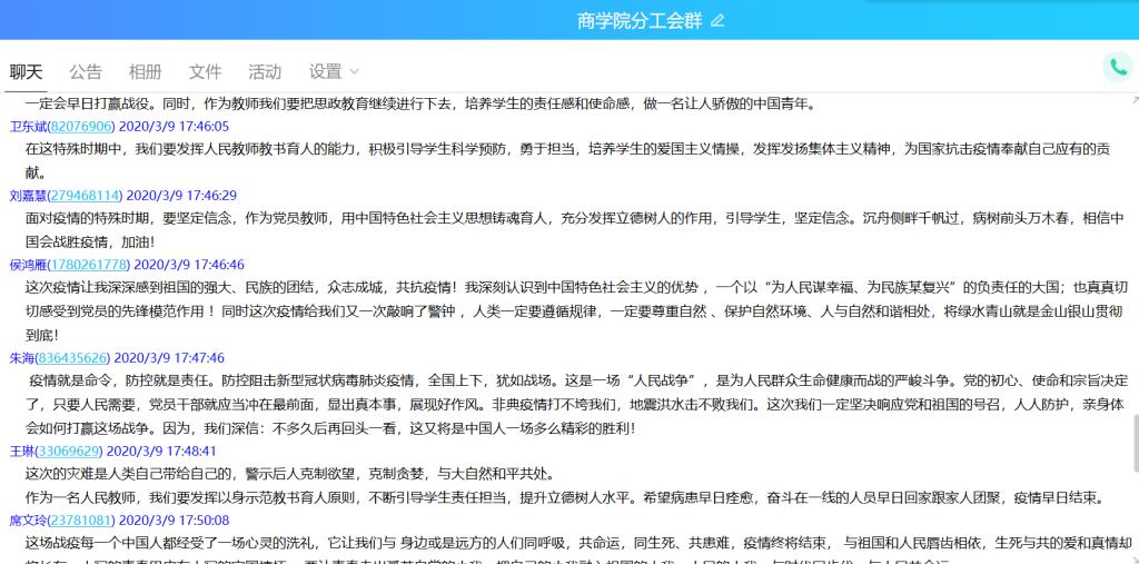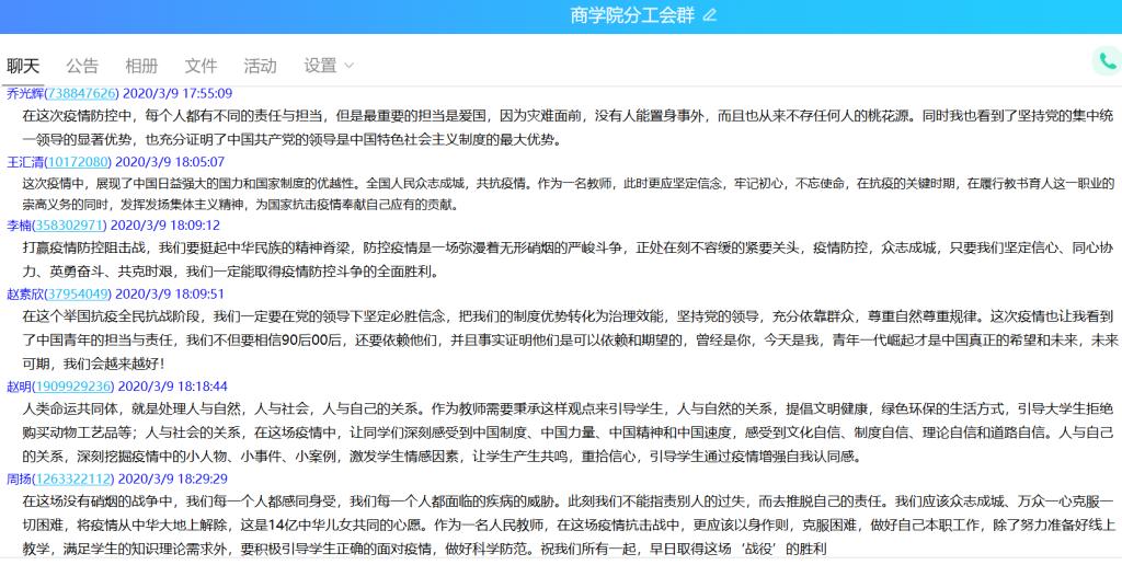 本次“同上一堂疫情防控思政大课”kaiyun登录中国入口登录共有28名教师,1531名学生参与观看,其中教师28人均参与了讨论发言,kaiyun登录中国入口登录共计41个班级在QQ群、微信群、在线课堂等渠道开展了讨论和发言。