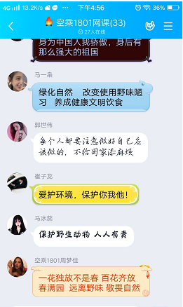 在学生群体中,课程反响更是异常热烈,我们的辅导员老师组织各班学生进行讨论,大家从构建自然和谐共生关系、加强生态文明建设、作为当代大学生应该怎样做、面对疫情大考、当代大学生能够做些什么、当代大学生的责任和担当是什么等方面积极发言讨论。
