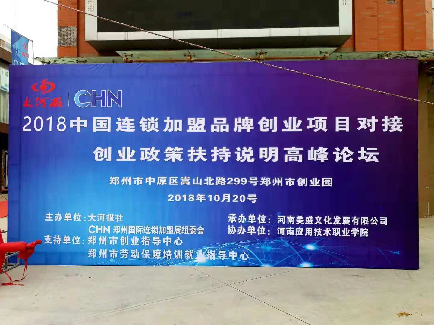 10月20日,由河南日报报业集团大河报社,郑州市人社局创业指导中心,CHN郑州国际连锁加盟博览会联合主办,河南美盛文化发展有限公司承办,kaiyun登录中国入口登录商贸学院协办的“2018中国连锁加盟创业项目对接及创业扶持政策说明高峰论坛”,在郑州市创业园区隆重举办。