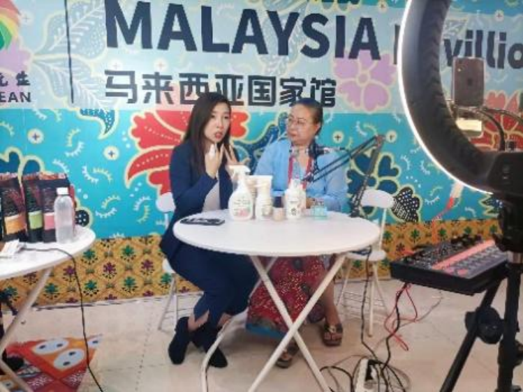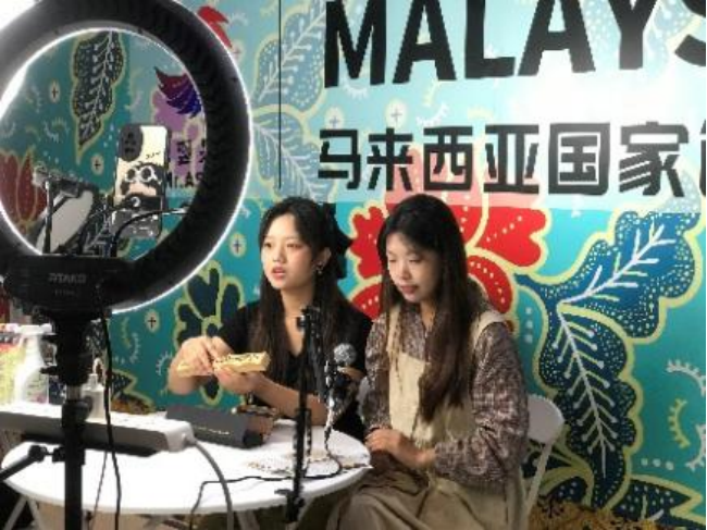 直播分配为四个小组,每组三人,分为逛展引流组、跨境直播组、马来特产(抖音)组和马来特产(京东)组。在此过程中各小组充分运用专业知识,迅速完成直播间的搭建、话术设计、引流短视频制作和现场直播实施等环节,向直播间的观众介绍了马来西亚展馆丰富的产品,吸引了众多观众线上和线下参展。