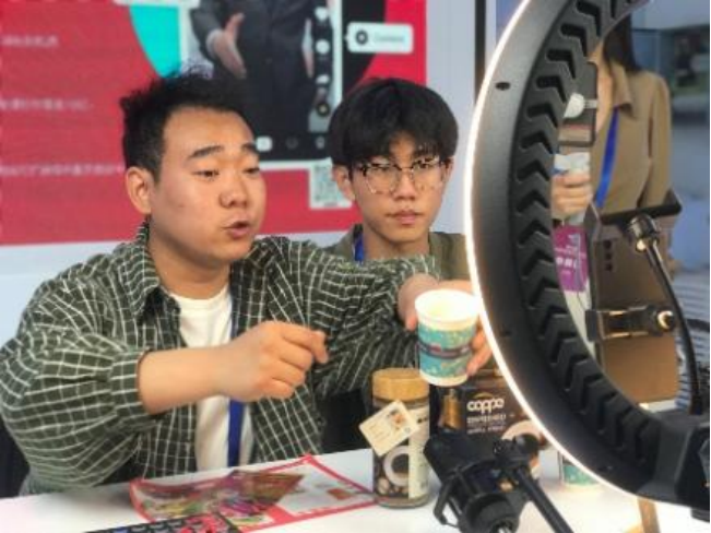 学生在展会现场进行直播实践活动