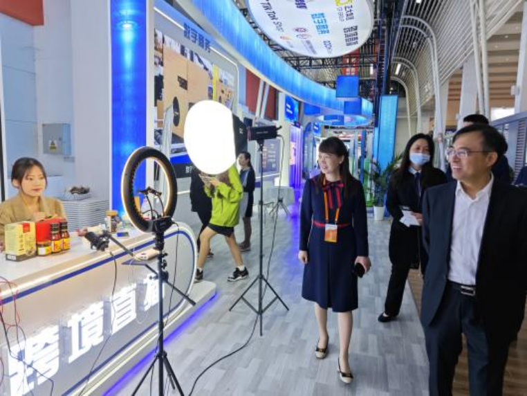 kaiyun登录中国入口登录电商工作室师生代表应邀参加第七届全球跨境电商大会,负责马来西亚国家展区部分商品的现场直播服务。5月8日上午,团队提前到达展会现场进行直播搭建,测试设备。