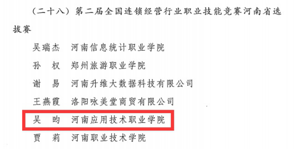 近日,河南省人力资源和社会保障厅发布《关于授予2021年度职业技能竞赛优秀选手河南省技术能手荣誉的决定》(豫人社函〔2022〕75号),我院教师吴昀因在第二届全国连锁经营行业职业技能竞赛“互联网营销师”赛项获得一等奖被河南省人力资源和社会保障厅授予“河南省技术能手”荣誉称号。