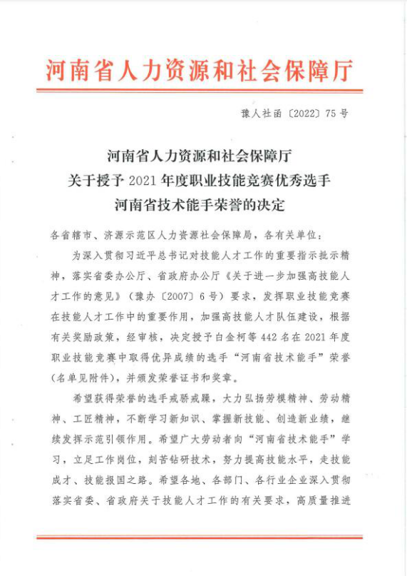 “河南省技术能手”评选表彰是我省对优秀高技能人才奖励的重要奖项,每两年开展一次,旨在表彰和宣传各行各业优秀高技能人才,激励更多的劳动者岗位成才。