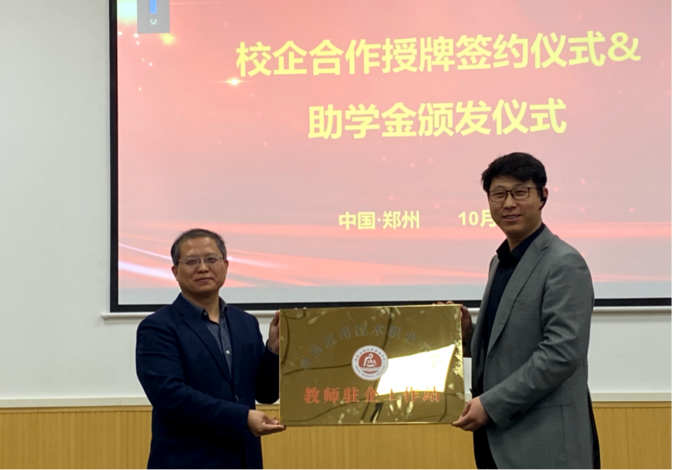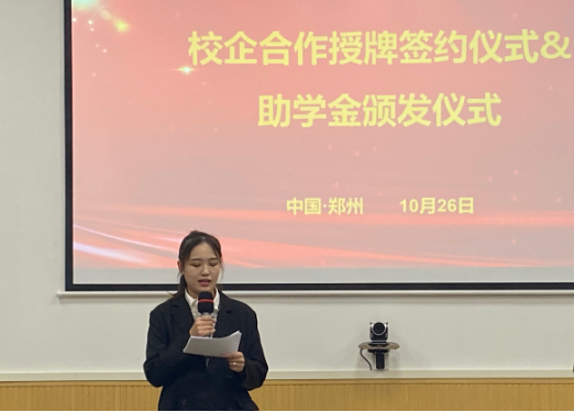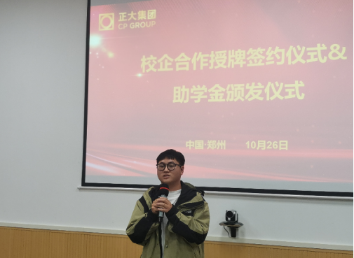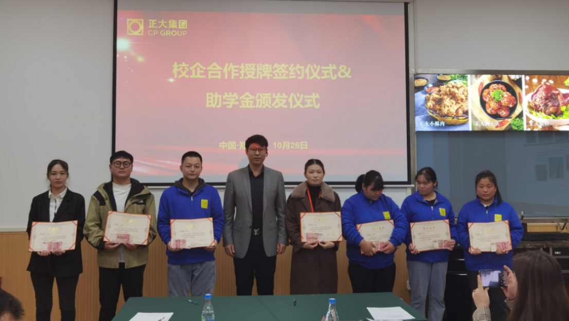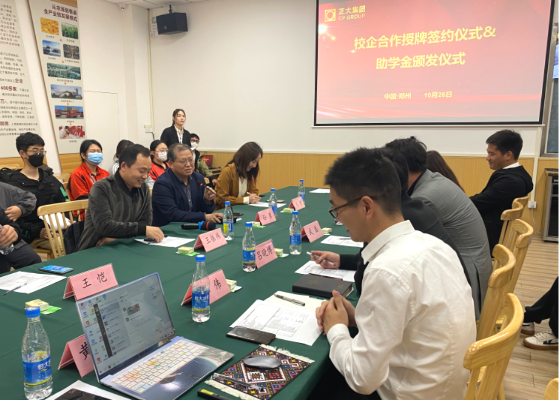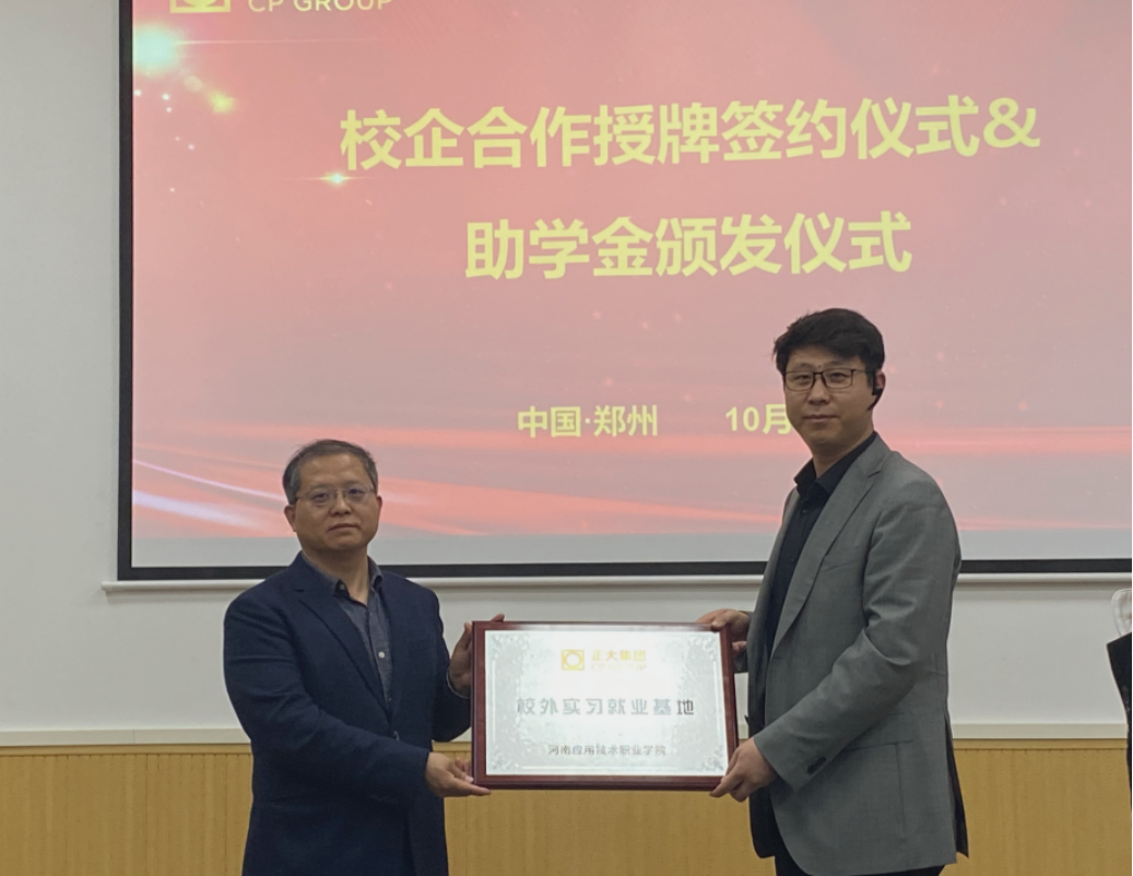 随后,双方举行了校企合作授牌签约仪式。我院教师驻企工作站、人才培养基地、校外实习就业基地在郑州正大卜蜂贸易有限公司正式挂牌。武磊总经理给我院优秀学生代表颁发企业助学金。这标志着校企双方在共同探索深层次融合上、合作方式、合作层次、合作领域又向前迈进一步。