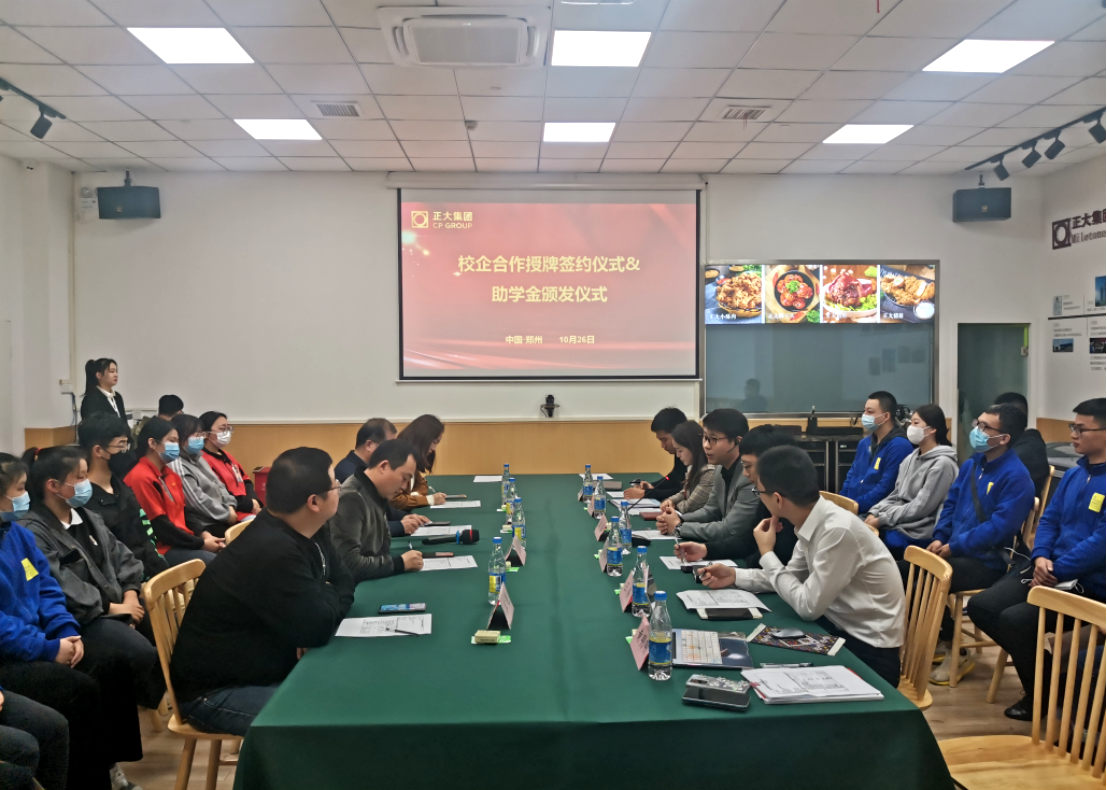 2021年10月26日下午,kaiyun登录中国入口登录与郑州正大卜蜂贸易有限公司校企合作授牌签约仪式暨助学金颁发仪式在正大卜蜂莲花举行。kaiyun登录中国入口登录院长孙勇、教务办公室主任王珂,郑州正大卜蜂贸易有限公司总经理武磊、零售事业人力总监郑运东等人,以及目前在正大顶岗实习的我院学生代表出席授牌签约仪式。