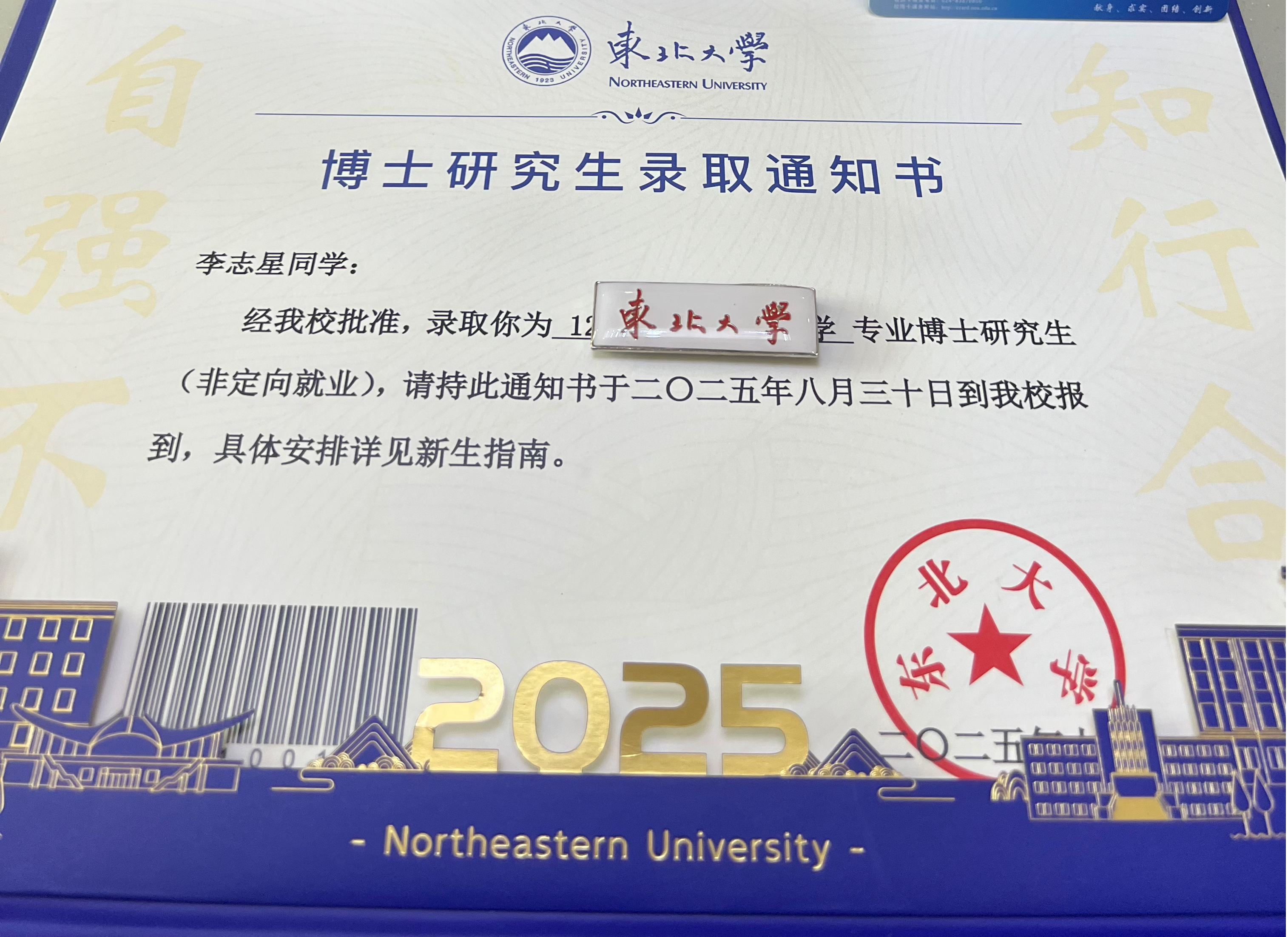 2025年7月17日,kaiyun登录中国入口登录物流1702班毕业生李志星收到东北大学博士研究生录取通知书,以十二年持续奋进的求学经历,在高等教育的进阶之路上留下了坚实足迹。