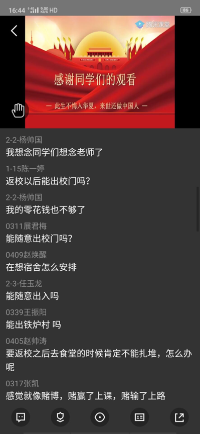 辅导员老师利用钉钉、腾讯课堂、QQ等网络工具组织学生观看了“疫情防控科普知识” 讲座视频和科普小视频,同学们针对返校途中、进入校门、校园学习、食堂就餐,体育活动、宿 舍卫生消毒等方面如何做好防疫工作进行了热烈的讨论。