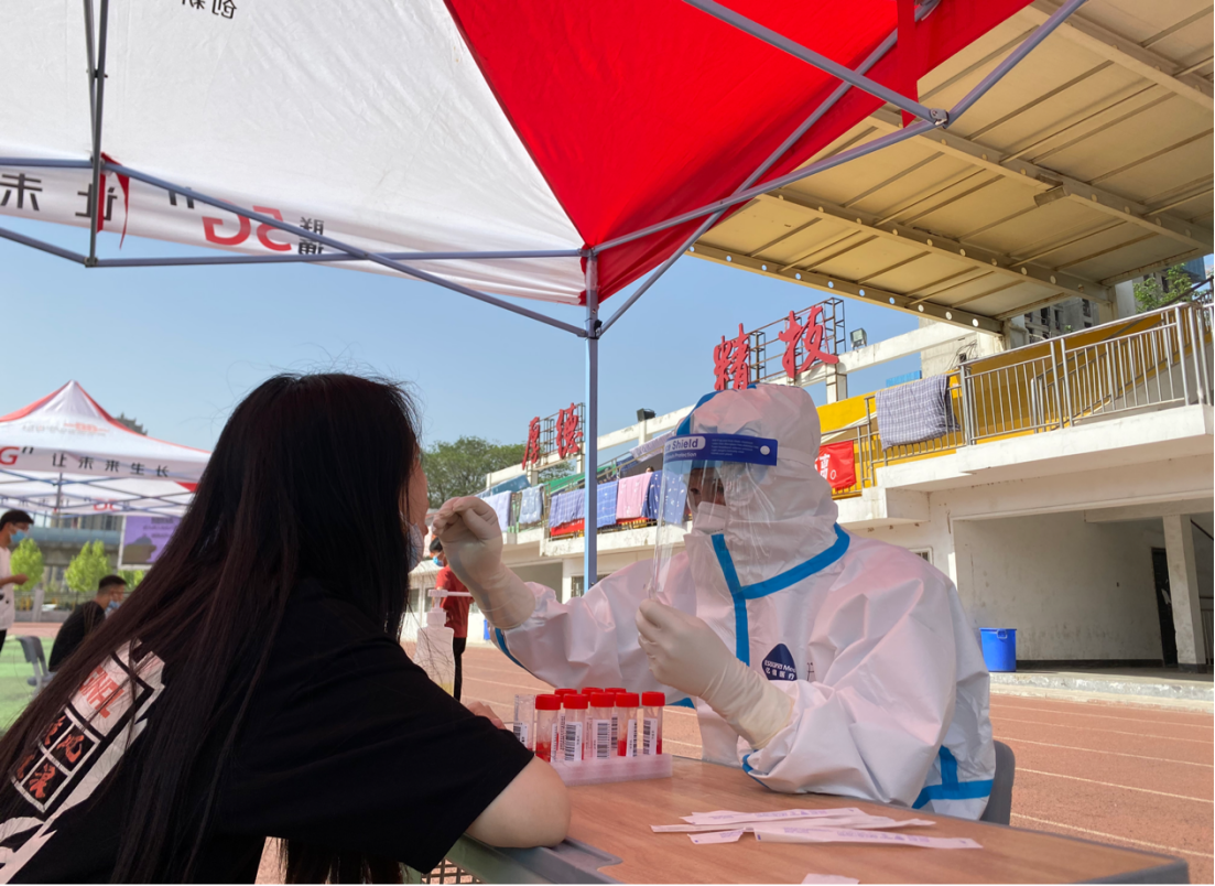 “全副武装”的医护人员在为同学们采集咽拭子