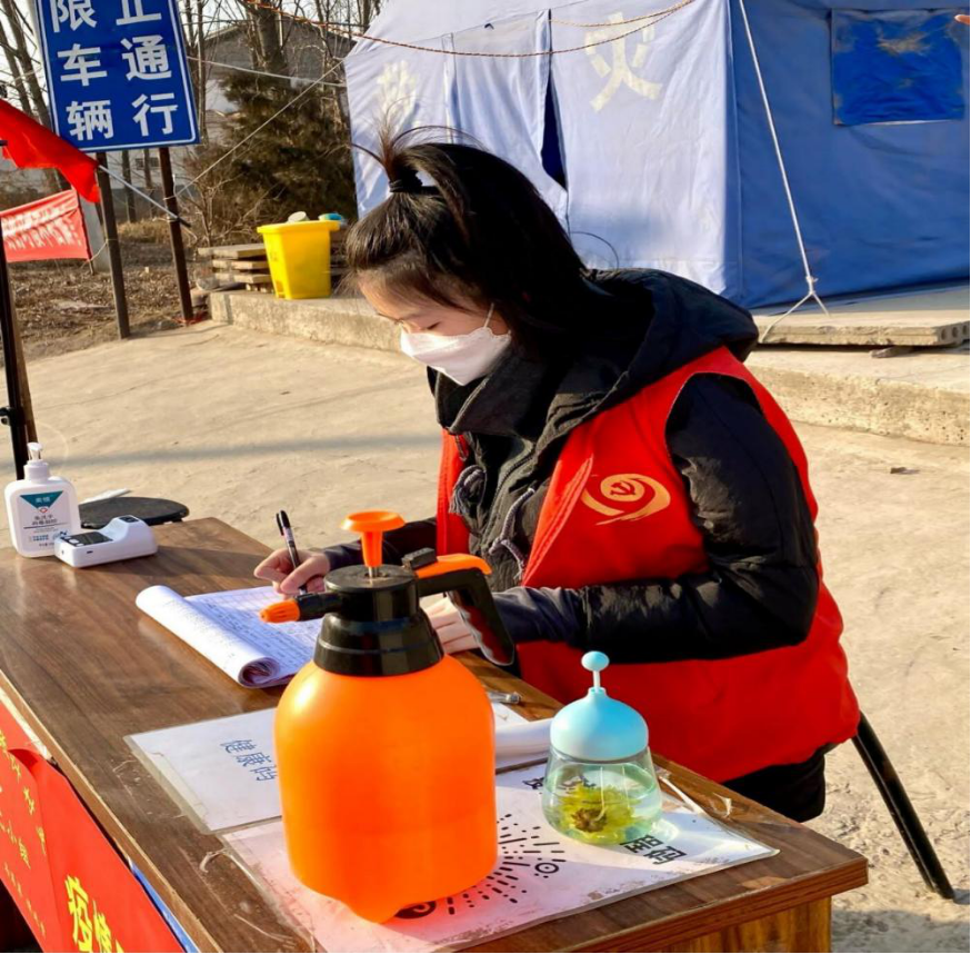 志愿服务感言:疫情面前,只要每个人防护到位,众人一心,就能铸就抗击疫情的铜墙铁壁。天气恶劣,我虽然戴着手套,穿着棉鞋,但是还需要用冻僵的双手,登记每一个进出往来人员的信息,双腿已经冻到麻木,耳朵被多层口罩勒出了血痕,但我选择继续坚持。作为新时代大学生,我们应当肩负时代使命,积极为国家奉献我们的力量。盼疫情早日平息,寒冬过去,清风徐来,桃花依然盛开。