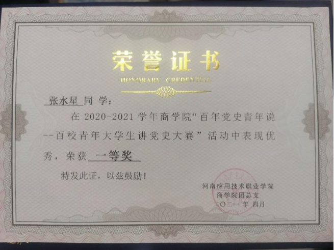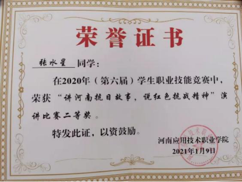 在2019年新冠疫情形势最严峻的时刻,张水星响应号召回到家乡投身于疫情防控,上级组织号召党员捐款,他以共青团员的身份积极进行捐款,获得了村支部的书面表扬。进入大学以来,五一假期、国庆假期、专升本期间、毕业招聘服务期间他全部留校参加志愿服务。在专业学习上面也没有落下,大一时期综合量化排名位居班级第二,曾经先后在中专时期获得了“河南省省级优秀学生干部”“河南省省级优秀应届大中专毕业生”“校级优秀学生干部”“校级优秀共青团员”等等,大学期间获得了“教育部第二届全国职业院校红色故事大赛三等奖”“国家励志奖学金”“校级优秀志愿者”“校级模范学生干部”等等,在学校的各类比赛活动和社会实践中,收获颇丰,硕果累累,此外,他还努力提升自身政治觉悟,积极向党组织靠拢,现已是一名入党积极分子,青马班学员,通过不懈的努力,他始终把自己锻炼成为一个“自立自强”的青年大学生为目标。