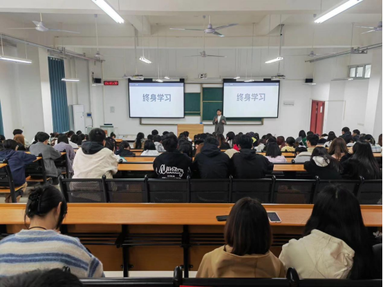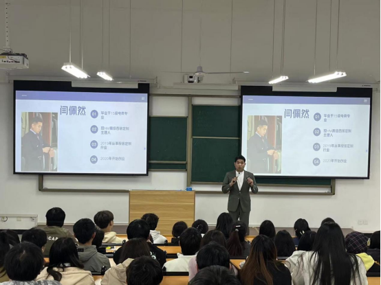 闫佩然首先从终身学习谈起,他表示不论同学们将来从事哪个行业,终身学习都是提升个人能力的重要途径。无论是专业技能,还是人际交往能力、思维方式,都需要通过学习来不断提升。其次,传授了创业需要明确目的、吃苦耐劳、以结果为导向。最后,他表示创业需要有一定承受风险的能力。没有百分之百的成功,任何事情准备得再充分,意外总是存在的,就算失败也要学会向前看。此外,他还向同学们阐述了相关职业生存的技巧,要敢于拼搏、为理想付诸行动。