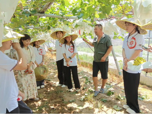 随后,青春“e”行团队成员跟随李老师深入田间地头,来到当地葡萄种植园,并向种植户咨询了种植葡萄的理念初衷和销售途径等关键问题。通过实地考察交流,团队成员深刻体会到新时代农户对优质农特产品的重视。种植户讲述了他们为提升葡萄品质寻找优质品种、先后前往多地区进行学习、在种植过程中严谨对待细心呵护葡萄,同时也了解到他们对拓宽市场的需求。为此,青春“e”行团队制定了以直播带货为核心的营销策略,团队成员们希望能将专业知识与社会实践紧密结合起来,发扬志愿服务精神,以专业所学助力新农人致富。