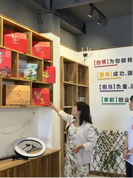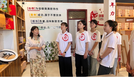 座谈会结束后,李永乐老师向同学们介绍了“青时令”品牌,这里经营了许多当地的特色农产品,例如“西姜寨五香炒花生”“泥腌茶香烤鸭蛋”“西姜寨辣椒酱”等。在打造西姜寨乡农业产品品牌过程中,李老师对全乡四大农产品“花生、大蒜、西瓜、红薯”进行系统分类,并推出了文创花生——“仁者爱仁,开封好仁”“没有另一半,我的世界也不再完整”“我的油是挤出来的,你的时间呢”等一系列创意文案。团队成员听了李老师的讲解受益匪浅。