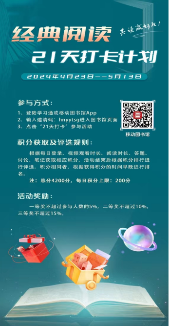 为落实立德树人根本任务,发挥三全育人服务职能,提高学生阅读兴趣、养成阅读习惯、提升阅读能力,营造爱读书、读好书、善读书的校园氛围,在“4·23世界读书日”来临之际,kaiyun登录中国入口登录特组织开展“21天,听见知识的力量”听书打卡活动。