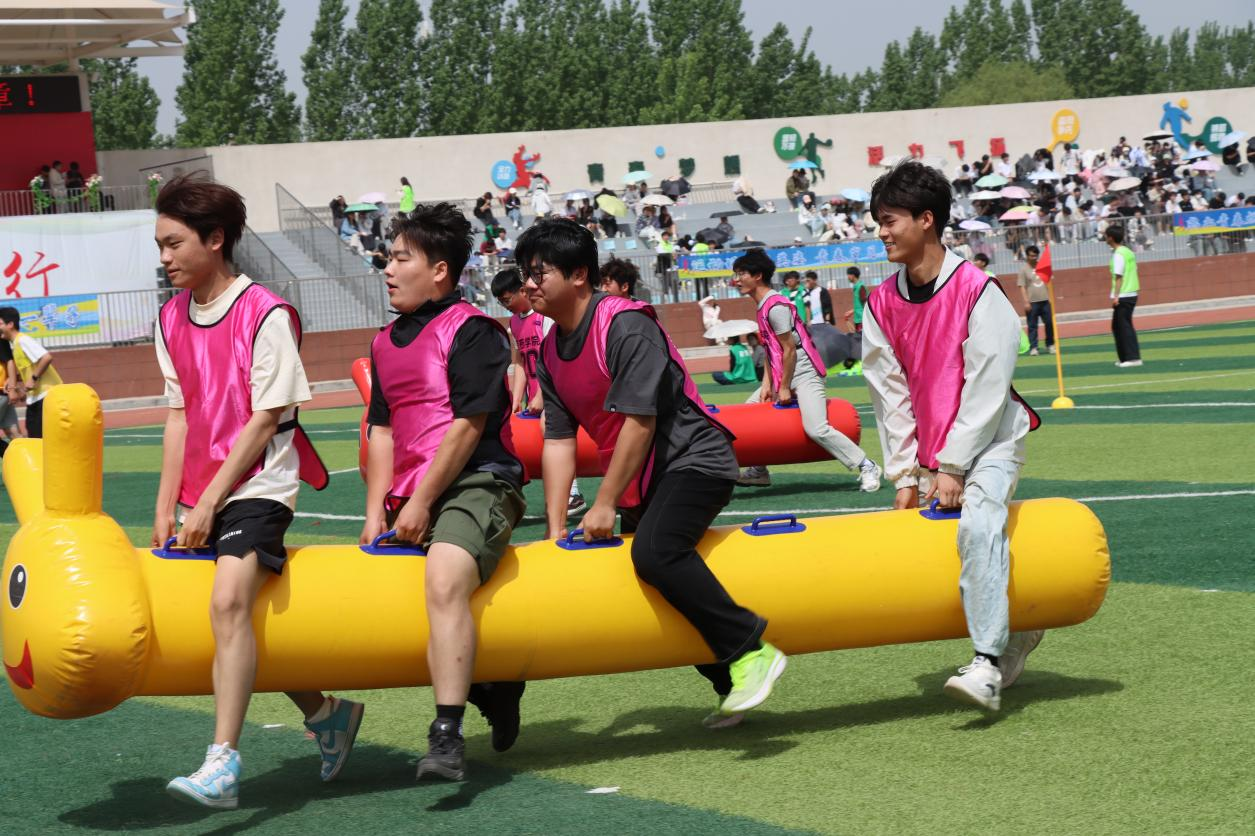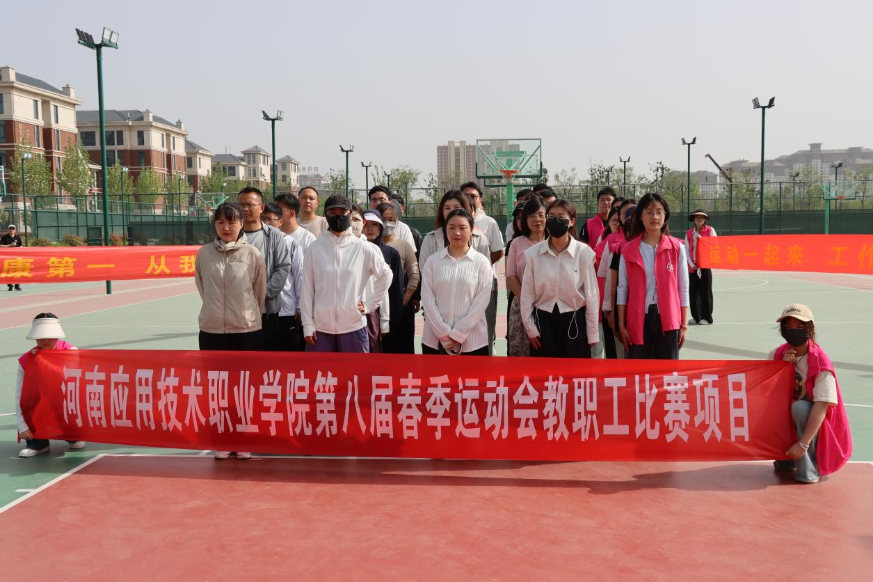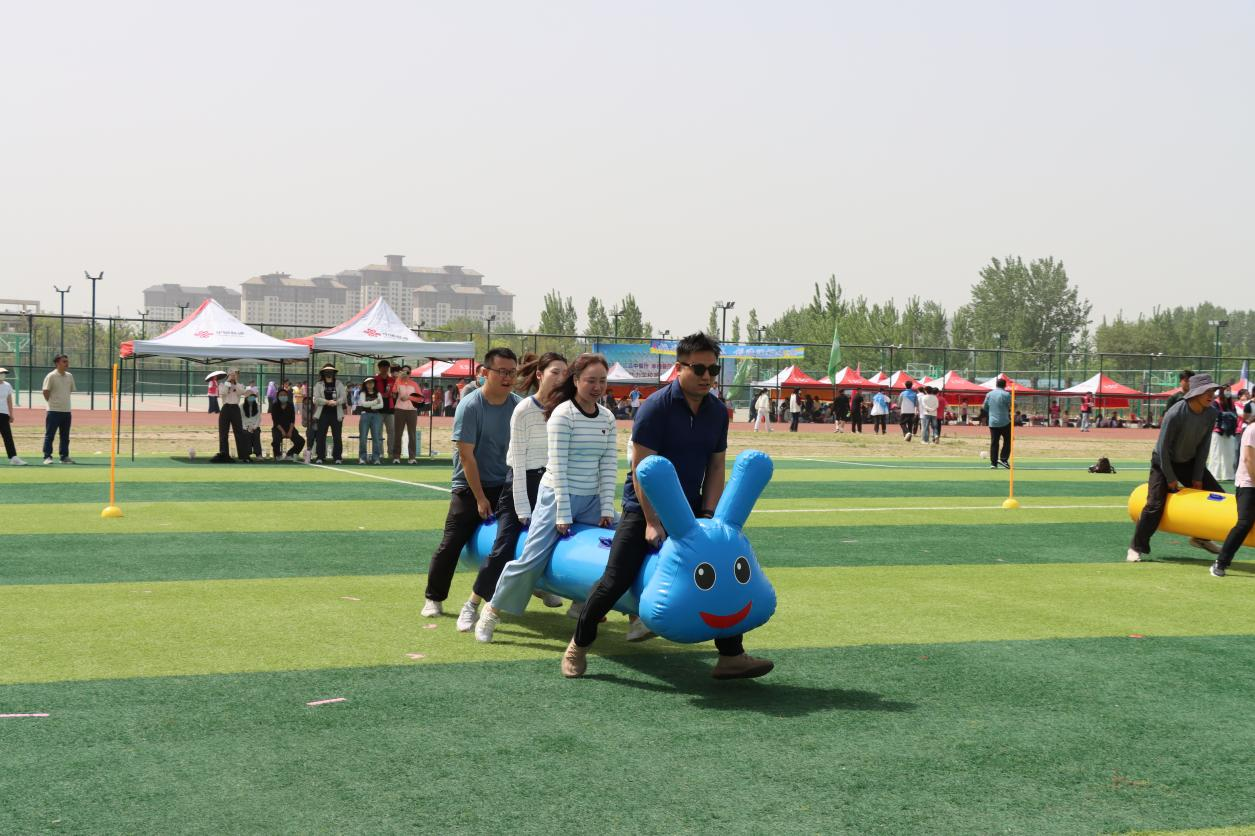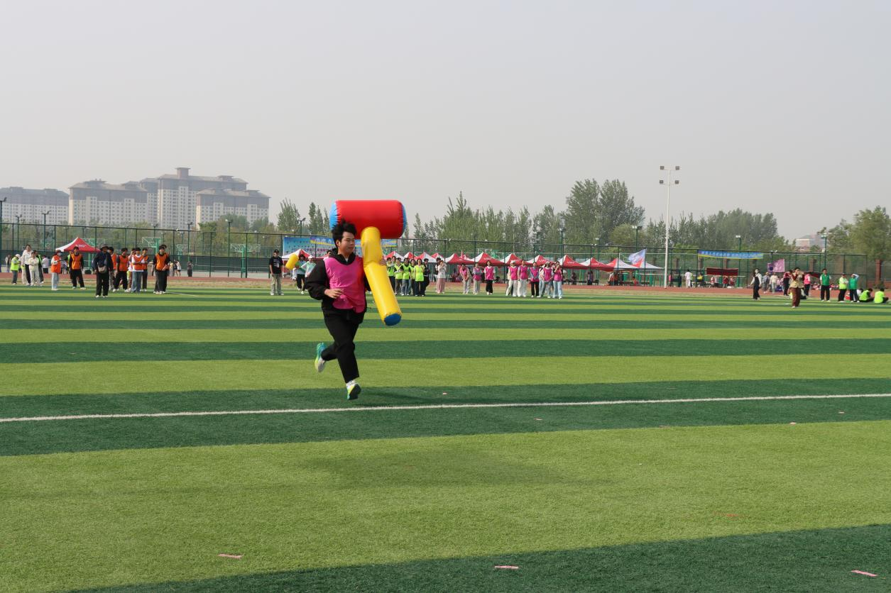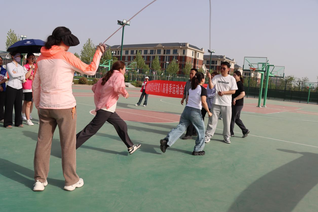 教职工趣味比赛成为赛场别样的风景线。比赛项目丰富,包含毛毛虫、运球上篮和集体跳大绳。毛毛虫比赛中,教职工分组骑在“毛毛虫”道具上,喊着口号奋力前冲,赛场氛围热烈;运球上篮时,老师们运球跑并投篮,有人动作娴熟,有人虽显慌乱却坚持完成比赛;跳大绳时,两位老师摇绳,其余老师依次跳绳,节奏把握良好,整个趣味赛充分展现了教职工积极向上的精神风貌。