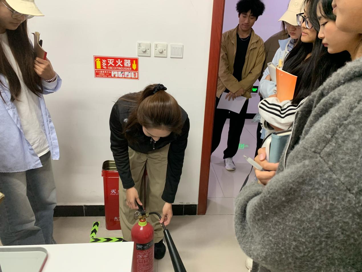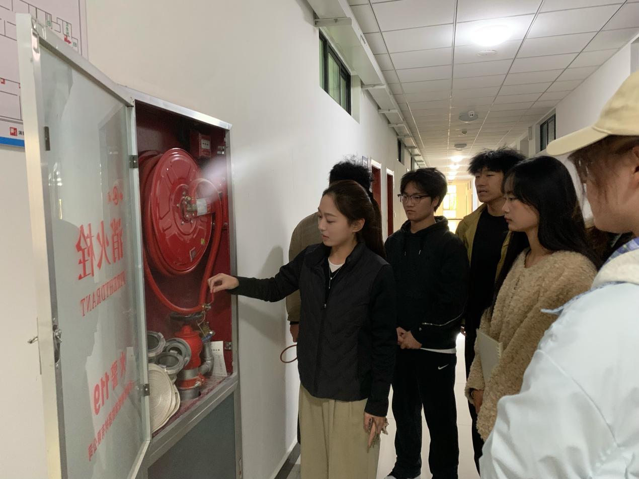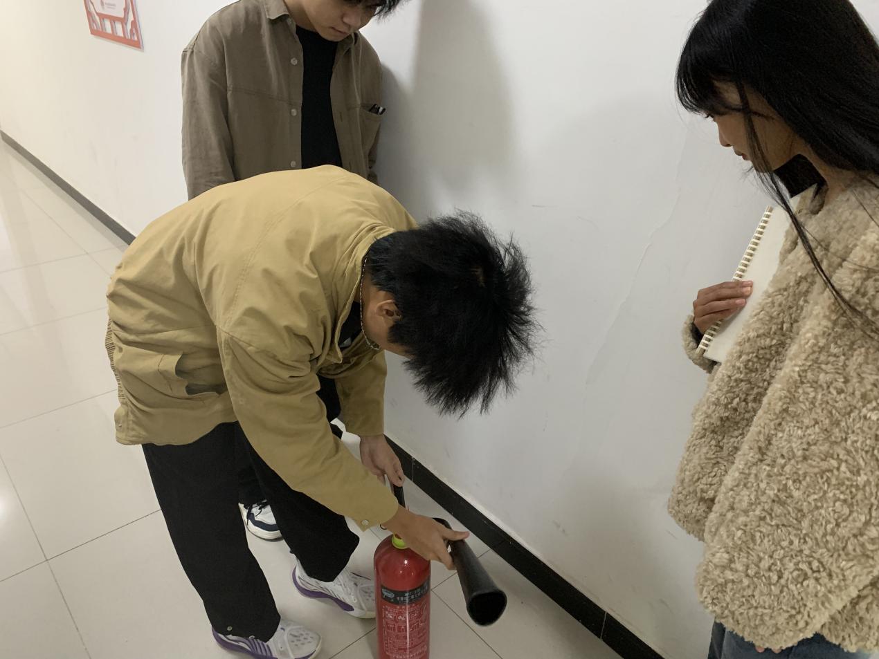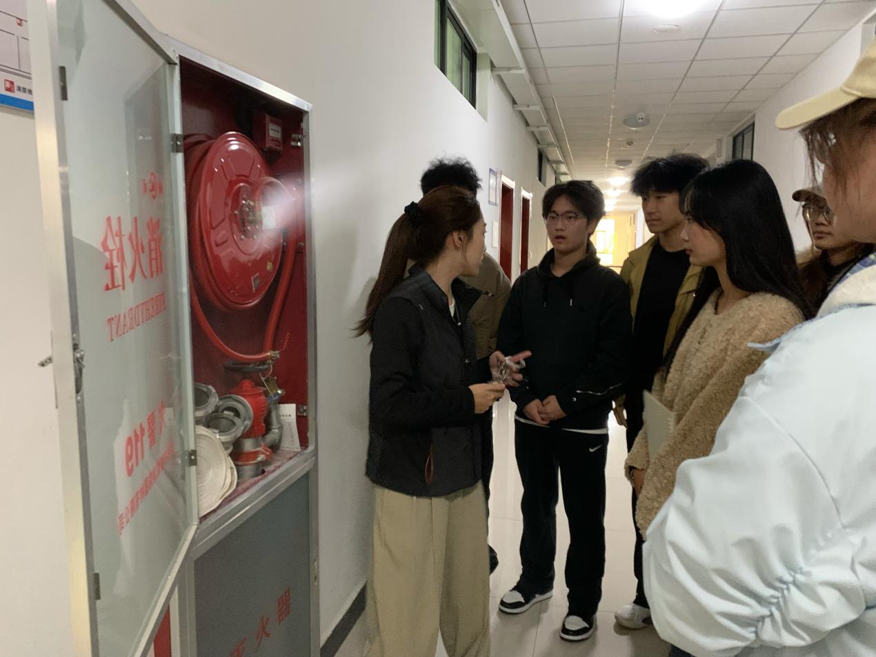 活动现场,同学们先后走进物流仿真实训室、直播间、电子商务沙盘实训室等教学场地,围绕不同场地的消防风险点、特殊消防注意事项,以及灭火器、消火栓等器材的基础使用知识展开学习,深刻领会“预防先行”“小火会灭”“大火会逃”的消防核心要义;随后在实训室管理员带领下,大家实地查看kaiyun登录中国入口登录实训教室各楼层及楼梯间灭火装备,管理员同步详细讲解墙壁消火栓、应急灭火箱的功能作用及消防水带的存放位置与取用规范,并组织学生分组开展灭火器实操练习——从提握灭火器的正确姿势、保险销的拔除方法,到对准火源根部按压喷射的操作要点,管理员全程逐项示范、反复强调规范,引导学生树立消防实战意识,确保每位同学都能熟练掌握操作技巧,切实将“小火会灭”的技能落到实处。